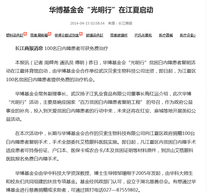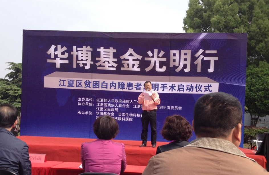2014年4月14日,我公司派代表參加在武漢市江夏區(qū)舉行的“華博基金光明行”江夏區(qū)貧困白內(nèi)障患者復(fù)明手術(shù)啟動儀式。