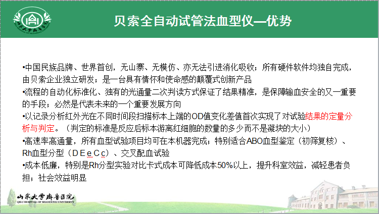 該儀器全自動化控制,操作簡便,使勞動強(qiáng)度降低、檢測效率提高,同時可避免人為失誤;應(yīng)用聚凝胺法可快速交叉配血,在處理急診病人配血需求上優(yōu)于卡式方法;其人性化的中文操作界面,可滿足不同規(guī)模、不同性質(zhì)使用單位對于操作程序的優(yōu)化設(shè)置等,以上特征均有利于質(zhì)量控制及科學(xué)化管理。
