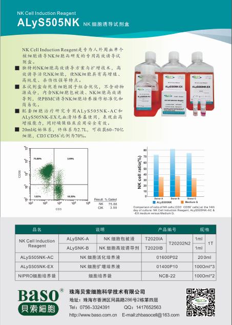 【產(chǎn)品概述】本產(chǎn)品是專為NK細(xì)胞高效活化誘導(dǎo)而設(shè)計(jì)的新一代(3.0A)NK細(xì)胞培養(yǎng)試劑盒,由ALySNK-A Reagent和ALySNK-B Reagent組成,含有優(yōu)質(zhì)級(jí)細(xì)胞因子及醫(yī)療級(jí)重組蛋白,不含動(dòng)物源成分,可高效誘導(dǎo)人外周血NK細(xì)胞。本試劑盒需配套ALyS505NK-AC/EX無血清培養(yǎng)基使用,可提高細(xì)胞增殖倍數(shù)、NK細(xì)胞純度和殺瘤活性,同時(shí)使NK細(xì)胞培養(yǎng)操作標(biāo)準(zhǔn)化和簡(jiǎn)易化。