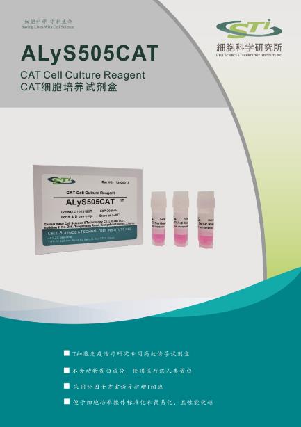 【產(chǎn)品概述】本產(chǎn)品是專為CAT(CIK)細胞高效活化誘導(dǎo)而研發(fā)的新一代CAT 細胞培養(yǎng)試劑盒,由CAT-A Reagent、CAT-B Reagent 和CAT-C Reagent 組成,含有優(yōu)質(zhì)級細胞因子及醫(yī)療級重組蛋白,不含動物源成分,不含滋養(yǎng)層細胞,可高效誘導(dǎo)人外周血PBMC培養(yǎng)CAT 細胞。本試劑盒需配套AlyS505N-0 無血清培養(yǎng)基使用,可提高細胞增殖倍數(shù)、CAT 細胞純度和殺瘤活性,同時使CAT 細胞培養(yǎng)操作標準化和簡易化。
