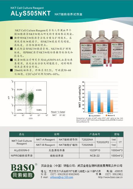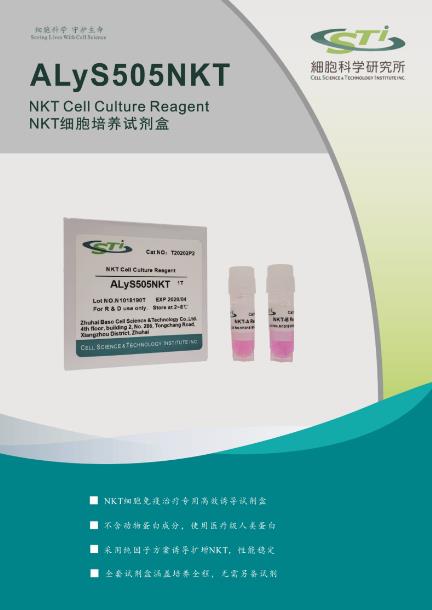 【產(chǎn)品概述】本試劑盒是專為NKT 細(xì)胞高效活化誘導(dǎo)而設(shè)計(jì)的新一代NKT 細(xì)胞培養(yǎng)試劑盒,由NKT-A Reagent、NKT-B Reagent 兩支試劑組成,含有優(yōu)質(zhì)級(jí)細(xì)胞因子及醫(yī)療級(jí)重組蛋白,不含動(dòng)物源成分,不含滋養(yǎng)層細(xì)胞,可高效誘導(dǎo)人外周血PBMC 培養(yǎng)NKT 細(xì)胞。本試劑盒需配套ALyS505N-0 無(wú)血清培養(yǎng)基使用,可提高細(xì)胞增殖倍數(shù)、NKT 細(xì)胞純度和殺瘤活性,同時(shí)使NKT 細(xì)胞培養(yǎng)操作標(biāo)準(zhǔn)化和簡(jiǎn)易化。