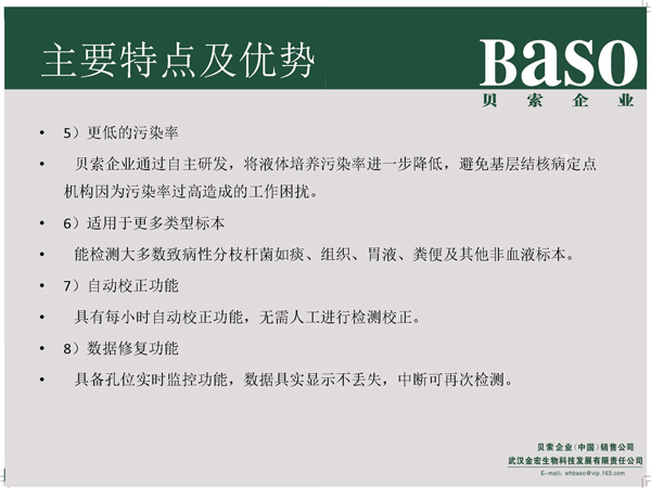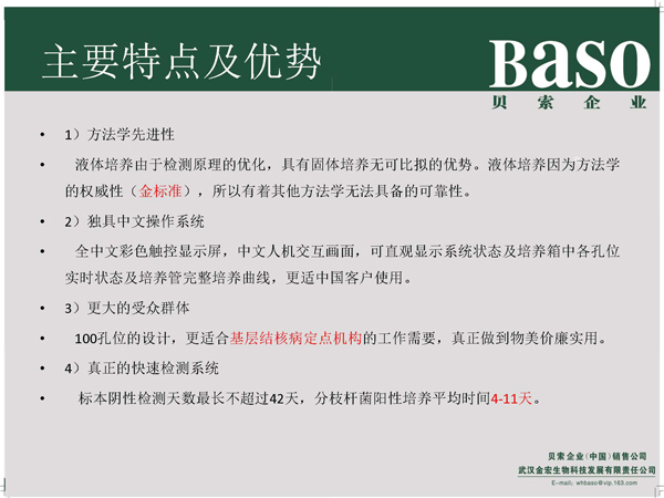 貝索全自動(dòng)分枝桿菌培養(yǎng)檢測(cè)儀充分考慮國(guó)內(nèi)現(xiàn)狀,根據(jù)客戶需求,分為BS-100型、BS-400型、BS-1000型,滿足不同標(biāo)本量客戶需求,為廣大基層醫(yī)療機(jī)構(gòu)---基層綜合醫(yī)院、基層�?漆t(yī)院、基層定點(diǎn)機(jī)構(gòu)、基層結(jié)核病實(shí)驗(yàn)室提供分枝桿菌液體快速檢測(cè)平臺(tái)及服務(wù)。