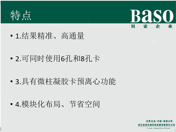 貝索全自動血型分析儀適用于微柱凝膠法檢測,操作簡便,敏感性高,可檢出低含量抗原抗體,結(jié)果清晰可靠、便于保存,并滿足多種數(shù)據(jù)管理的要求,適用于各類大中小醫(yī)院、血站、疾控中心等單位的ABO血型正反定型、Rh血型鑒定和不規(guī)則抗體篩選、交叉配血等實驗自動化檢測。