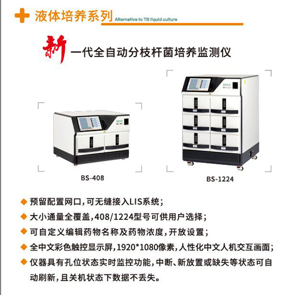 | BX2104 | 全自動分枝桿菌培養(yǎng)監(jiān)測儀 | BS-408 | 臺 | 用于分枝桿菌液體培養(yǎng)、檢測及藥敏實驗 |